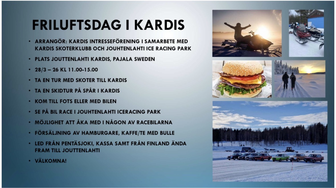 Se på bil race i Jouhtenlahti Iceracing Park. Möjlighet att åka med i någon av racebilarna. Försäljning av hamburgare, kaffe/te med bulle.