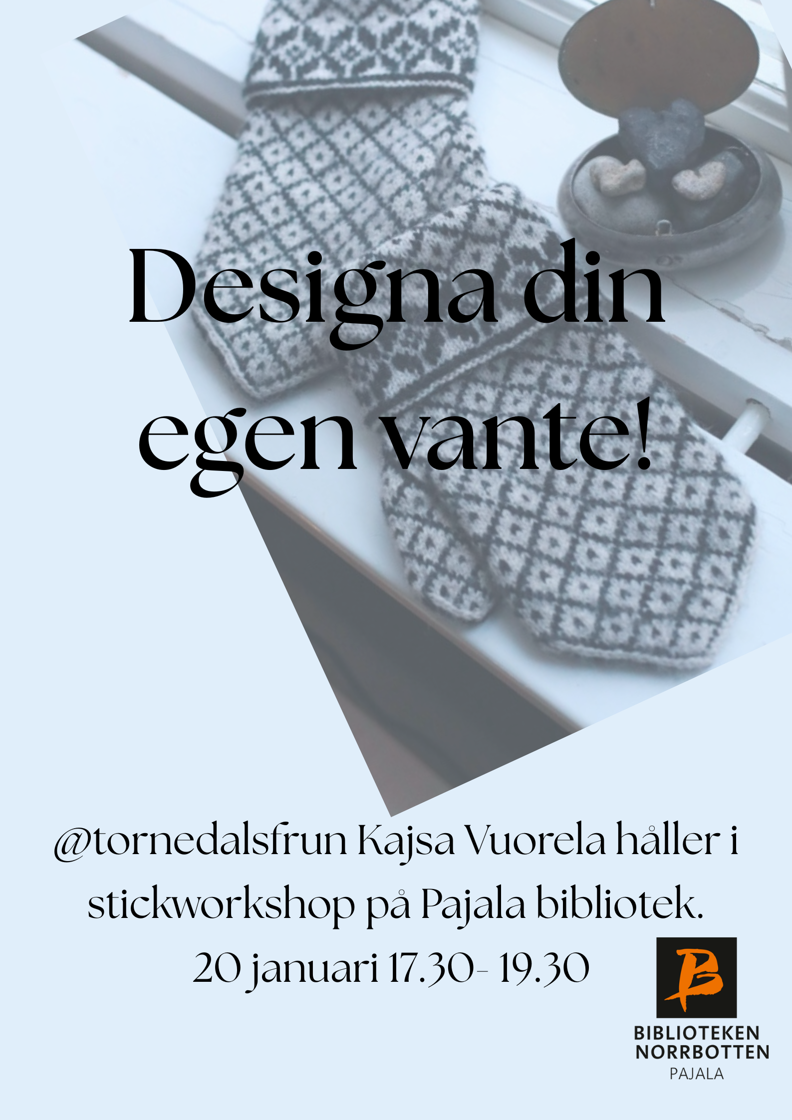 Kom på stickworkshop! @tornedalsfrun Kajsa Vuorela är på plats för att hjälpa dig designa ditt eget mönster att sticka vantar av. Välkommen!