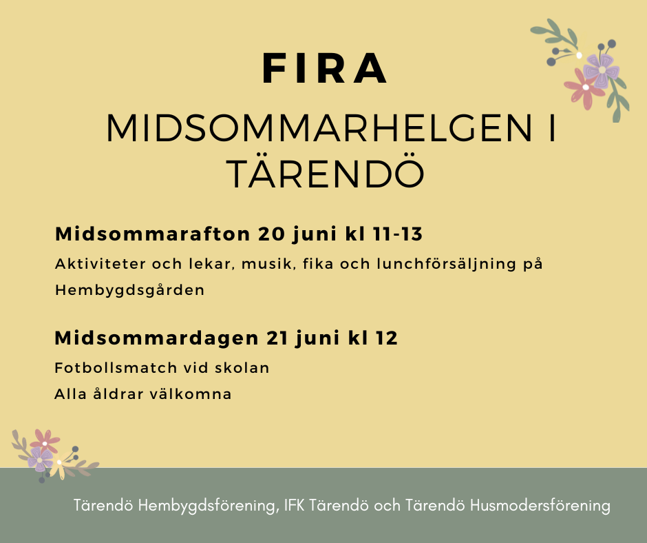 Tärendö Hembygdsförening Bifurkationsvägen 25, Tärendö, SverigeVälkommen att fira midsommar på vackra Hembygdsgården i Tärendö! Fredag 20 juni 11-13 💐Vi dekorerar och reser midsommarstången tillsammans ☀️ Mysig sommarmusik av [...]